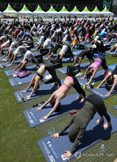 | △ 서울광장에서 즐기는 요가 (서울=연합뉴스) 한종찬 기자 = 21일 오전 서울 시청광장에서 국민생활체육전국요가협회 주최로 열린 열린 '제 1회 세계 요가의 날' 행사에서 참가자들이 요가를 하고 있다. 2015.6.21 saba@yna.co.kr |
