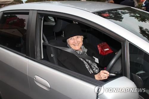 △ (시드니=연합뉴스) 김기성 특파원 = 한국전쟁 당시 유엔군으로 참전한 남편을 잃은 호주 여성 올윈 그린(91·가운데) 여사가 21일 시드니에서 호주 참전자를 기리기 위한 행사에 참석한 뒤 자신의 차량에 앉아 미소를 짓고 있다. 2015.6.22