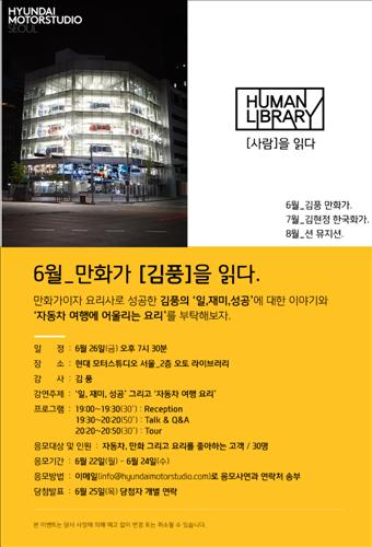 (서울=연합뉴스) 조재영 기자 = 현대자동차[005380]는 브랜드 체험관 '현대 모터스튜디오'에서 다양한 분야의 명사를 초청해 인생과 자동차에 관한 이야기를 나누는 토크쇼 이벤트 '휴먼 라이브러리'를 진행한다고 22일 밝혔다.