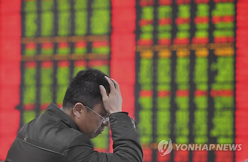 △ '산' 높으면 '골'도 깊지… (AP=연합뉴스) 19일(현지시간) 중국 주가의 폭락 사태 속에 안후이(安徽)성 푸양(阜陽)의 증권사 객장에서 주식 시세를 바라보던 한 투자자가 머리에 손을 댄 채 낙담한 표정이다. 상하이종합지수는 오후 3시 23분 현재 7.52% 떨어진 3,122.56로, 지난 2008년의 최대 낙폭 기록에 근접했다. 중국 증시의 이날 폭락은 지난 12개월 동안 상하이지수가 60% 이상 급등한 것과 관련, 중국 당국이 현지 3대 증권사의 신용거래에 대해 제재를 취하면서 우려가 확산됐기 때문. bulls@yna.co.kr An investor holds his head as he monitors stock prices at a brokerage house in Fuyang in central China's Anhui province Monday, Jan. 19, 2015. Chinese shares plunged 6.3 percent Monday after the country's securities regulator imposed margin trading curbs on several major brokerages, a sign that authorities are trying to rein in the market's big gains. (AP Photo) CHINA OUT