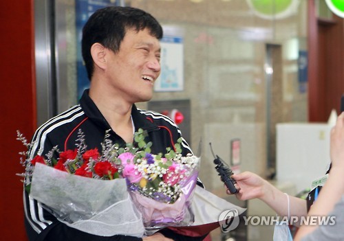 | △ 메르스 완치하고 퇴원하는 우종하씨 (평택=연합뉴스) 중동호흡기증후군(메르스)을 이겨내고 경기도 평택굿모닝병원을 퇴원하는 우종하씨가 꽃다발을 받은 후 환하게 웃고 있다. << 평택굿모닝병원 제공 >> drops@yna.co.kr http://blog.yonhapnews.co.kr/geenang |