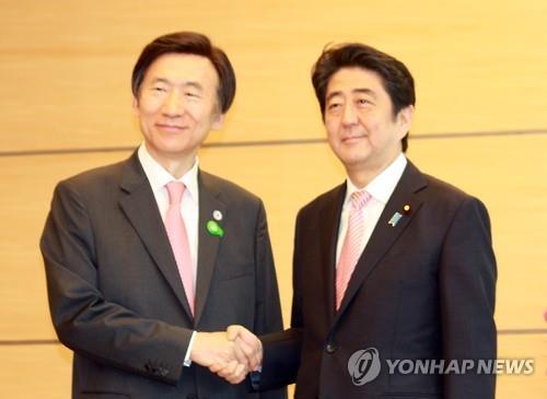 △ 악수하는 윤병세(왼쪽) 한국 외교부 장관과 아베 신조 일본 총리.