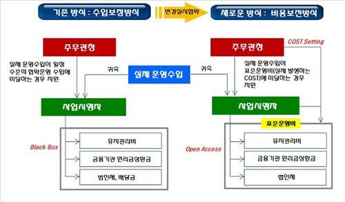 이에 국토부는 KB사모펀드와 계약을 체결하면서 최소운임수입보장 방식을 폐지하고 운영에 필요한 최소 비용을 표준운영비로 정해 실제 운임수입이 이에 못 미치면 그 차액을 지원하는 비용보전방식을 도입한다.