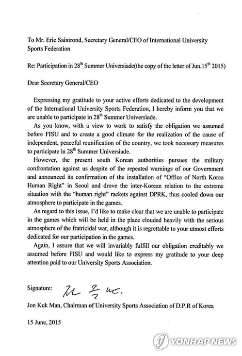 △ 북한이 보낸 광주하계유니버시아드 대회 불참 메일