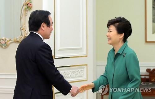 | △ 박근혜 대통령이 22일 오후 청와대를 방문한 누카가 후쿠시로 일한의원연맹 회장을 접견하기에 앞서 악수하고 있다. |