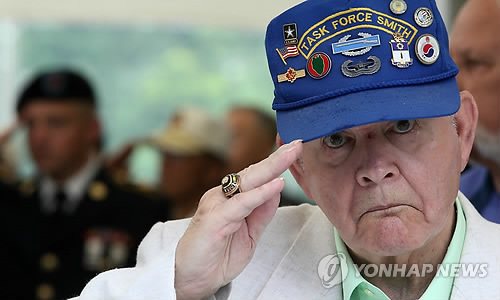 | △ 2014년 7월 유엔군 초전 기념식에서 당시 참전했던 한 노병이 거수경례를 하고 있다.(연합뉴스 자료사진) |