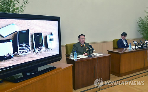 △ "북한, 남한 주민 2명 '간첩' 혐의로 체포" (평양 조선중앙통신=연합뉴스) 북한 당국은 3월26일 남한 주민 2명을 '간첩' 혐의로 체포했다고 발표했다. 조선중앙통신은 이날 "반공화국 정탐·모략행위를 감행하다가 적발체포된 괴뢰정보원 간첩 김국기, 최춘길 씨의 국내외 기자회견이 26일 인민문화궁전에서 열렸다"고 밝혔다. 사진은 김국기(오른쪽)씨로 알려진 남성이 기자회견에 임하는 모습. 2015.3.27 photo@yna.co.kr
