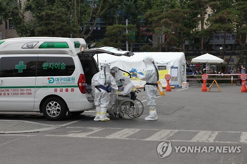 △ 대구 메르스 환자 경북대병원 이송 (대구=연합뉴스) 대구 첫 중동호흡기증후군(메르스) 확진 환자인 공무원 A(52)씨가 집중치료를 받기 위해 17일 오후 대구의료원에서 경북대병원으로 이송됐다. 2015.6.17 << 경북대병원 >> mshan@yna.co.kr