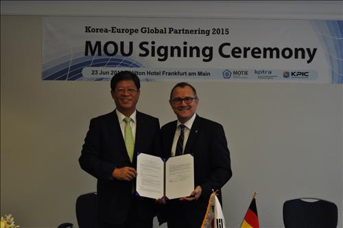 | △ 코트라가 23일(현지시간) 독일 프랑크푸르트에서 헤센주 무역투자공사와 국내기업의 현지진출 및 기술개발 협력을 위한 업무협약(MOU)을 맺었다.(왼쪽부터 김재홍 코트라 사장, 라이너 발트쉬미트 헤센주 무역투자공사 사장) |