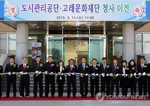 | △ 울산남구도시공단·고래문화재단 이전 현판식 (울산=연합뉴스) 11일 울산시 남구 장생포 옛 울산해경 청사에서 남구도시관리공단과 고래문화재단 이전 현판식이 열렸다. 서동욱 남구청장 등 참석자들이 기념테이프를 자르고 있다. 2015.3.11 << 울산시 남구 >> hkm@yna.co.kr |