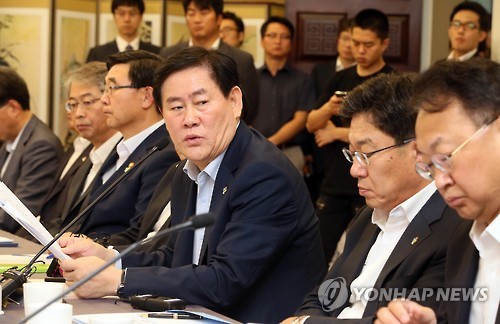 △ 최경환, 하반기 경제정책방향 설명 (서울=연합뉴스) 진성철 기자 = 최경환 경제부총리가 25일 국회 귀빈식당에서 열린 하반기 경제정책방향 당정협의에서 인사말하고 있다. 오른쪽 부터 유일호 국토교통부 장관, 윤상직 산업통상자원부 장관, 최 부총리, 이기권 고용노동부 장관, 임종룡 금융위원장.