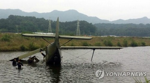 △ 하천에 추락한 공군 소속 훈련기 (옥천=연합뉴스) 박병기 기자 = 25일 오후 1시 7분께 충북 옥천군 군서면 상중리 하천에 공군 소속 T-11 훈련기가 추락했다. 이 사고로 1명이 다쳐 군용 헬기로 통해 이송 중이다. 2015.6.25 vodcast@yna.co.kr