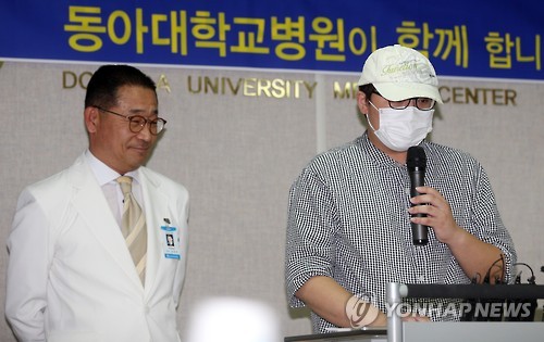 △ 퇴원 메르스 143번 환자 "죄송합니다" (부산=연합뉴스) 김선호 기자 = 부산의 두 번째 중동호흡기증후군(메르스) 확진자이자 143번 환자인 이모(31)씨 25일 완치판정을 받고 퇴원하며 "시민에게 죄송하다"는 말을 하고 있다. 왼쪽은 김상범 병원장. 2015.6.25 wink@yna.co.kr
