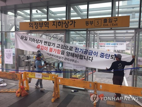 △ 의정부역 지하상가 출입통제 (의정부=연합뉴스) 권숙희 기자 = 25일 경기도 의정부역 지하상가 배전실에서 침수 사고가 나 상가점포에 출입이 전면 통제되고 있다. 2015.6.25 suki@yna.co.kr