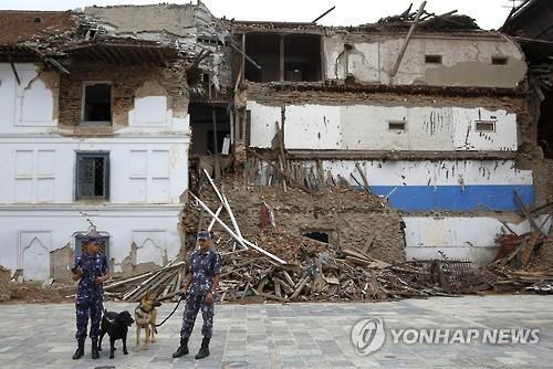 | △ 24일 네팔 카트만두 더르바르 광장에서 경찰이 경비견과 함께 순찰하고 있다.(EPA=연합뉴스) |