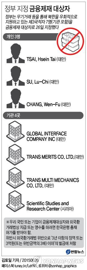 정부가 26일 지정한 금융제재 대상은 대만 국적의 개인 3명과 기관 4곳(대만 3곳, 시리아 1곳) 등이다.