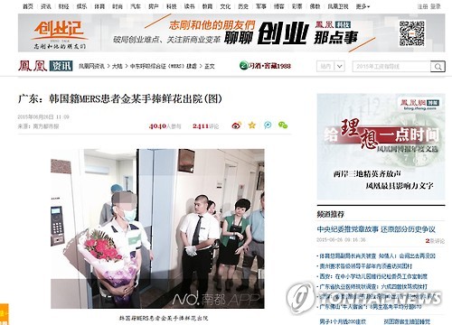 | △ 중국간 메르스 환자 퇴원 (서울=연합뉴스) 중국에서 치료를 받아오던 국내 10번째 중동호흡기증후군(메르스) 환자 K(44)씨가 완치 판정을 받고 26일 오전 퇴원했다. 보건복지부는 중국 측에서 이 환자의 퇴원 사실을 알려왔다고 밝혔다. 홍콩 봉황망이 이날 광둥(廣東)성 현지 매체인 남방도시보(南方都市報)의 보도를 전재해 K씨 퇴원소식을 알리고 있다. 2015.6.26 << 홍콩 봉황망 캡처 >> photo@yna.co.kr |