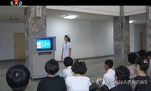 △ 북한, 메르스 방역 강화 (서울=연합뉴스) 북한이 중동호흡기증후군(메르스)을 막기위해 전국가적인 사업을 진행하고 있다고 조선중앙TV가 24일 전했다. 메르스 관련 교육 받고 있는 북한 주민들 2015.6.24 nkphoto@yna.co.kr