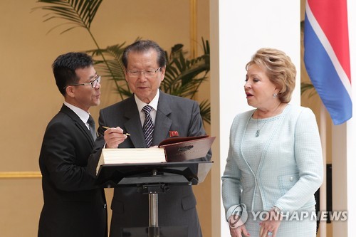 | △ 러시아 상원 방문한 북한 최태복 의장 (모스크바=연합뉴스) 유철종 특파원 = 방러 중인 북한 최고인민회의(우리 국회 격) 최태복 의장이 23일(현지시간) 러시아 상원을 방문해 영접나온 발렌티나 마트비옌코 의장이 지켜보는 가운데 방명록에 글을 남기고 있다. 2015.6.23 cjyou@yna.co.kr |