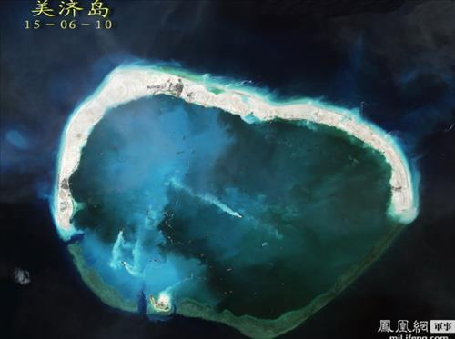△ '완성단계'에 있는 것으로 알려진 중국의 남중국해 인공섬 '미스치프 환초'(중국명 메이지자오(美濟礁)). <<홍콩 봉황망 캡처>>