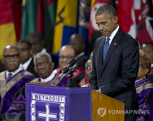 △ 오바마, 총기난사 흑인교회 목사 장례식 참석 (찰스턴 AP=연합뉴스) 버락 오바마 미국 대통령이 26일(현지시간) 사우스캐롤라이나주 찰스턴에서 거행된 흑인교회 총기난사 희생자 클레만타 핑크니 '이매뉴얼 아프리칸 감리교회' 목사 장례 예배에 참석, 추도 연설을 하고 있다.