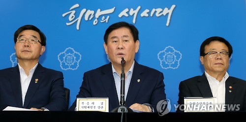 | △ 2015년 하반기 경제정책방향 (서울=연합뉴스) 최재구 기자 = 최경환 경제부총리(가운데)가 지난 25일 정부서울청사에서 열린 '경제활력 강화와 구조개혁 가시화 2015년 하반기 경제정책방향' 발표 관계부처 합동 브리핑에서 기자의 질문에 답하고 있다. |