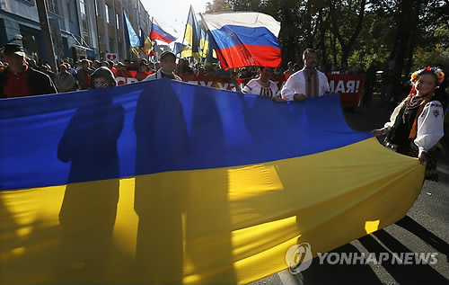 | △ epa04411234 People carry a Ukrainian national flag during an anti-war rally in Moscow, Russia, 21 September 2014. Several thousand opposition activists took part in the 'Peace March', protesting against Russia's role in the Ukrainian conflict. EPA/YURI KOCHETKOV |