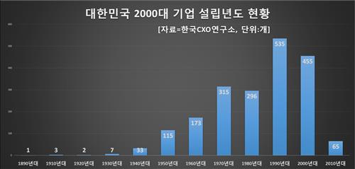 기업분석 전문업체 한국CXO연구소(소장 오일선)는 '국내 2천대 기업 회사 설립 연도 분석현황'에서 이같은 결과를 얻었다고 29일 밝혔다.