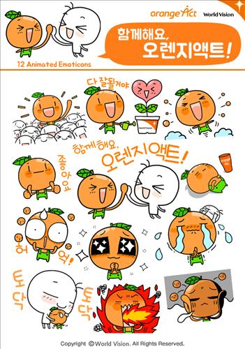 | △ (서울=연합뉴스) 국제구호단체 월드비전은 내달부터 오렌지액트 캠페인 후원금을 카카오페이로 결제하면 이모티콘을 무료로 제공하는 서비스를 시작한다고 29일 밝혔다. 사진은 무료로 제공하는 이모티콘. 2015.6.29 << 월드비전 제공 >> |