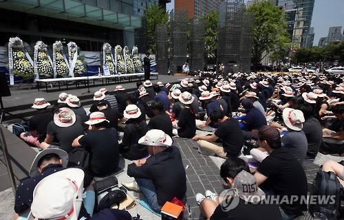 △ 삼성사옥 앞 삼성테크윈 노조원들 (서울=연합뉴스) 박동주 기자 = 삼성그룹의 삼성테크윈 한화 매각을 반대하는 삼성테크윈 노동조합원들이 29일 오전 서울 서초구 삼성사옥 앞에서 집회를 하고 있다. pdj6635@yna.co.kr