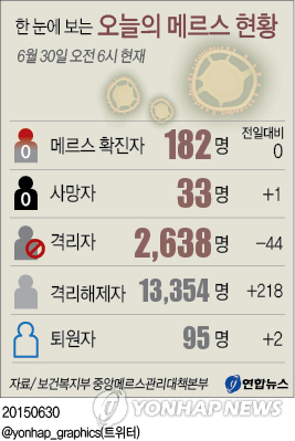 보건복지부 중앙메르스관리대책본부는 30일 오전 6시 현재 메르스 확진자가 전날과 동일한 182명이며 퇴원자는 2명 증가한 95명, 사망자는 1명 늘어난 33명으로 집계됐다고 밝혔다.