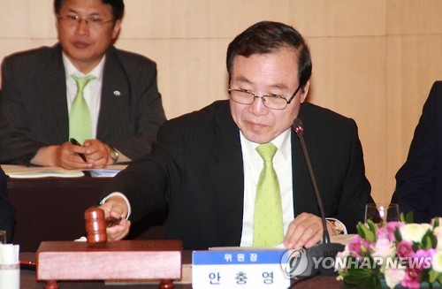 | △ 동반위원장 "MRO가이드라인, 상생협약 전환이 해법" (서울=연합뉴스) 안충영 동반성장위원장이 30일 오전 서울 서초구 반포동 팔래스호텔에서 열린 제35차 동반성장위원회에서 의사봉을 두드리고 있다. 안 위원장은 동반성장위원회가 소모성자재구매대행(MRO·Maintenance, Repair and Operations) 가이드라인을 상생협약으로 대체하기로 가닥을 잡았다고 밝혔다. (동반성장위원회 제공) |