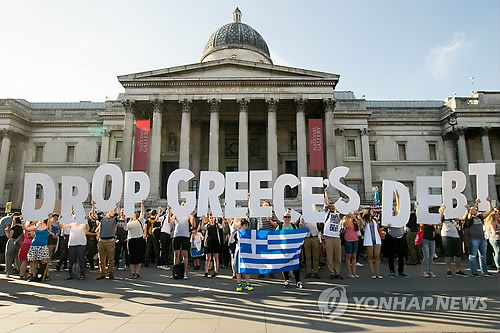 | △ '그리스 부채를 탕감하라' (런던 AP=연합뉴스) 그리스와 국제채권단의 협상결렬로 그리스의 디폴트(채무불이행) 위기가 고조되는 가운데 유럽중앙은행(ECB)의 구제금융상환 정책에 반대하는 사람들이 29일(현지시간) 영국 런던 트라팔가 광장에서 '그리스 부채를 탕감하라'(DROP GREECE'S DEBT)는 문구를 들고 시위를 벌이고 있다. marshal@yna.co.kr |