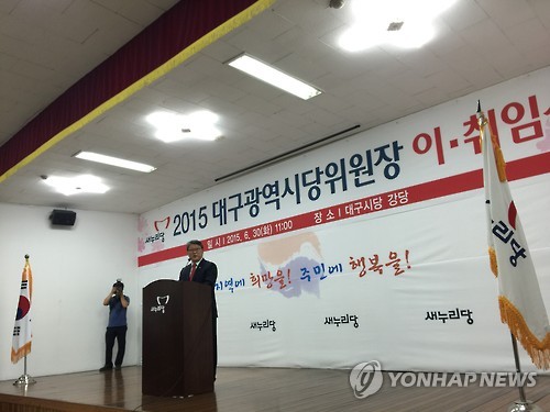 | △ 인사하는 조원진 새누리 대구시당 위원장 (대구=연합뉴스) 김선형 기자 = 30일 새누리당 대구시당에서 조원진 위원장이 모두발언을 하고 있다. 2015.6.30 sunhyung@yna.co.kr |