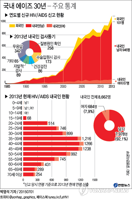 에이즈 감염 환자를 연도별로 보면 2004년에는 610명이었다가 2006년 749명, 2008년 797명, 2011년 888명, 2013년 1천114명 등으로 해마다 증가 추세를 보이고 있다.