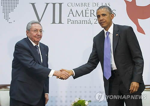 | △ 지난 4월 파마나시티에서 열린 미주기구 정상회의에서 만나 악수하는 라울 카스트로 쿠바 국가평의회의장과 버락 오바마 미국 대통령 (AP=연합뉴스) |