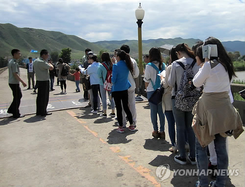 △ 북한 입국하는 중국인 관광객들 (투먼=연합뉴스) 지난해 북한 하루 관광에 나선 중국인 관광객들이 지린성 투먼시에서 도보로 국경다리를 건너 함경북도 온성군 남양구로 향하고 있다. 관광객들은 여권 대신 국경관광용 통행증을 손에 들고 있다.