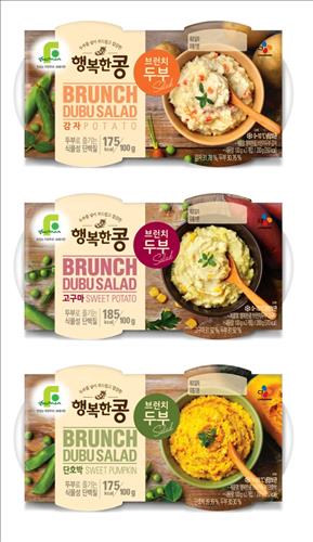 '행복한 콩 브런치 두부' 3종은 두부를 브런치 콘셉트에 맞춰 각각 단호박, 고구마, 감자와 함께 갈아 넣은 샐러드 타입의 두부다.