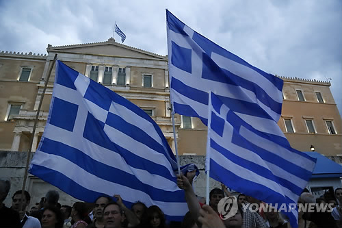 | △ '국가부도' 그리스 운명은… (아테네 AP=연합뉴스) 그리스가 국제통화기금(IMF)의 채무 상환 만기일인 지난달 30일(현지시간)을 넘기면서 부도상태에 빠졌다. 그리스는 상환 시한까지 돈을 갚지 못해 IMF 71년 역사상 선진국 중 처음으로 채무를 갚지 않는 나라가 됐다. 사진은 이날 아테네 의회 앞에서 오는 5일 열릴 국민투표에서 채권단의 수정안을 받아들이자는 집회가 열린 모습. 2010596@yna.co.kr Demonstrators hold Greek flags during a rally organized by supporters of the YES vote to the upcoming referendum in front of the Greek Parliament in Athens, Tuesday, June 30, 2015 Greece's European creditors were assessing a last-minute proposal Athens made for a new two-year rescue deal, submitted just hours before the country's international bailout program expires and it loses access to billions of euros in funds. (AP Photo/Petros Karadjias) |