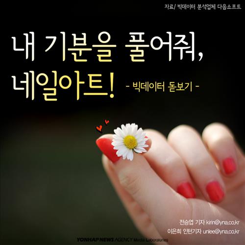 (서울=연합뉴스) 전승엽 기자·이은희 인턴기자 = 기분 전환을 하고 싶은데, 헤어스타일을 바꾸긴 부담스럽고 술을 마시자니 다음날 출근이 걱정되고… 이럴 때 네일 숍에 가면 소소한 행복을 찾을 수 있다고 한다. 사회관계망서비스(SNS)에서 네일아트에 대한 반응은 어떤지 알아본다.