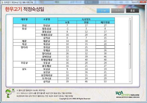 한우 성별과 도체 등급 판정 요인 10개 항목 결과를 프로그램에 입력하면, 소비자가 원하는 정도의 부드러움(보통·연함·매우 연함)에 이르기 위해 며칠동안 숙성해야 하는지 알려준다.