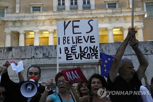 | △ 그리스 '국가부도' (아테네 AP=연합뉴스) 그리스가 국제통화기금(IMF)의 채무 상환 만기일인 지난달 30일(현지시간)을 넘기면서 부도상태에 빠졌다. 국제통화기금(IMF) 대변인은 "IMF 이사회에 그리스의 '체납'(arrears) 사실을 알렸다"며 "체납이 해결돼야 그리스는 IMF 구제금융을 받을 수 있을 것"이라고 말했다. 그리스 정부는 지난달 5일 만기가 돌아왔던 3억 유로(약 3천781억원)를 포함 부채 15억5천만 유로(약 1조 9천억원)를 지난달 말에 일괄적으로 갚을 계획이라고 밝힌 바 있다. 사진은 오는 5일 국민투표에서 채권단의 수정안을 받아들일 것을 촉구하는 아테네 의회 앞의 이날 집회 도중 참석자들이 구호를 외치는 모습. |