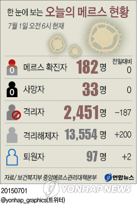 1일 보건복지부 중앙메르스관리대책본부에 따르면 이날 메르스 추가 환자가 발생하지 않아 28일 이후 나흘째 메르스 확진자 수는 182명에 머무르고 있다.