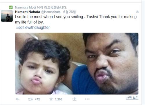 | △ 나렌드라 모디 인도 총리가 자신의 트위터 계정에 리트윗한 '딸과 함께 셀카'사진.<<나렌드라 모디 총리 트위터 캡처>> |