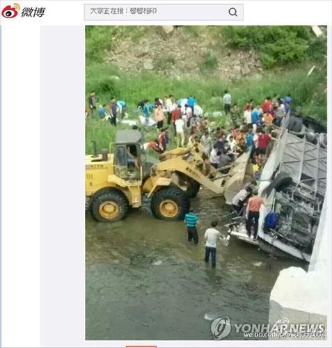 | △ 中 연수 공무원 추락사고 수습현장 (서울=연합뉴스) 중국 연수를 떠난 행정자치부 소속 지방행정연수원 교육생을 태운 버스가 다리에서 추락해 사상자가 20여 명에 이르는 사고가 발생했다. 1일 오후 5시30분께(현지시간) 중국 지린(吉林)성 지안(集安)에서 한국인 20여명을 태운 버스가 지안과 단둥(丹東) 경계지점 조선족마을 부근 다리에서 하천으로 추락했다. 사진은 추락사고 수습 현장의 모습. 2015.7.2 << 웨이보 화면 캡쳐 >> photo@yna.co.kr |
