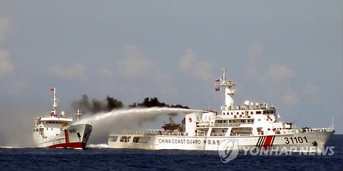 | △ 중국 해안경비정이 베트남 어선에 물 대포를 쏘는 모습(AP=연합뉴스 자료사진) |