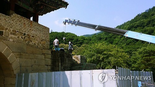△ 문경새재는 보수 중 (문경=연합뉴스) 손대성 기자 = 경북 문경새재 1관문 누문(樓門)으로 오르는 계단이 이탈돼 공사업체가 보수공사를 벌이고 있다. 2015.7.2 sds123@yna.co.kr