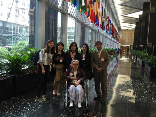 △ 미국 워싱턴D.C.를 방문 중인 일본군 위안부 피해자 김복동(89·가운데 휠체어에 앉은 분)할머니가 2일(현지시간) 오후 미 국무부를 찾아 관리들에게 위안부 문제 해결을 촉구한 뒤 청사 내에서 기념촬영을 했다. 김 할머니 바로 뒷편은 윤미향 한국정신대문제대책협의회 상임대표. 2015.7.3