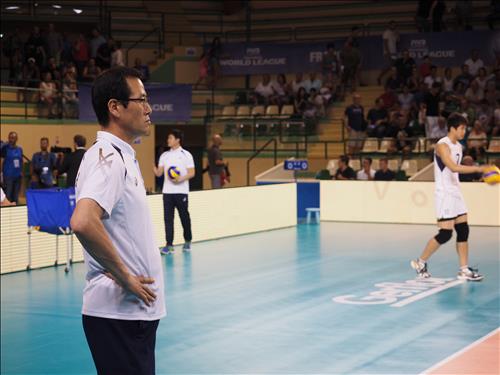 △ (카스텔노 르 레즈<프랑스>=연합뉴스) 김지헌 기자 = 문용관 남자배구 대표팀 감독이 2일(현지시간) 프랑스 카스텔노 르 레즈의 샤방델마스 실내경기장에서 열린 2015 월드리그 국제남자배구대회 한국과 프랑스의 경기를 지켜보고 있다. 2015.7.2 jk@yna.co.kr