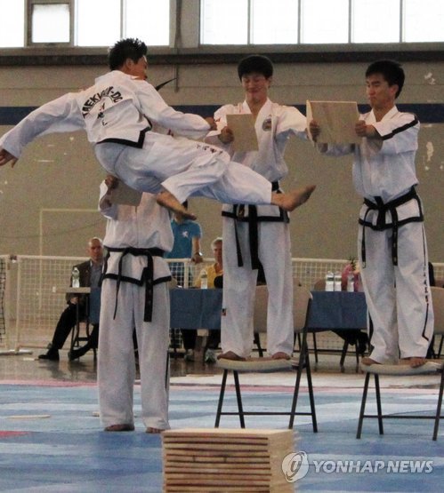 | △ 북한 태권도 시범단이 지난 2011년 미국 뉴욕에서 공중 격파 시범을 보이는 모습. |